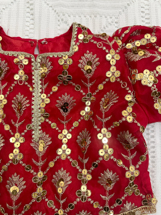 ❤️ Red Golden Fancy Organza Choli with Golden Jamawar Lehenga and Net Dupatta
