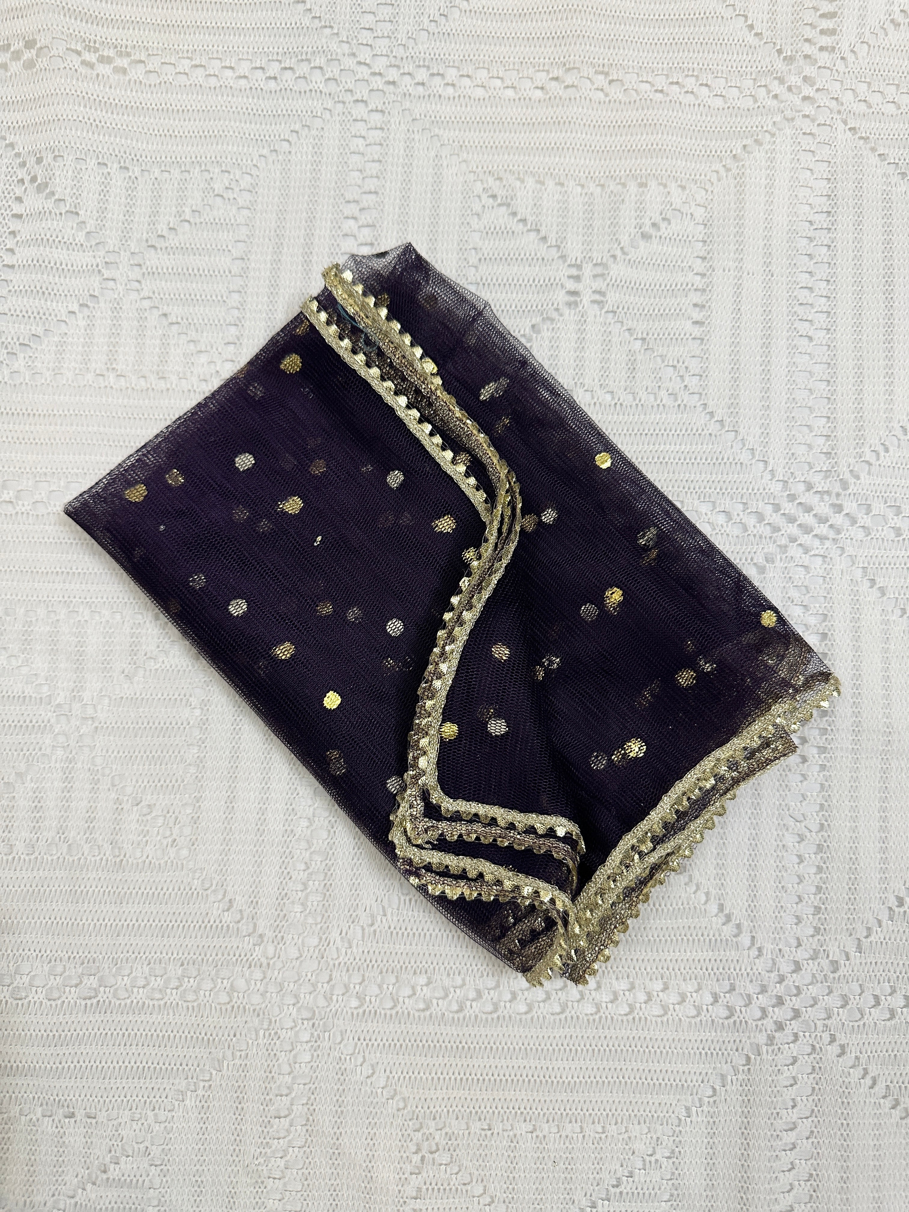 Lightweight Net Dupatta in a matching deep tone, enhanced with golden accents to complete the festive ensemble
